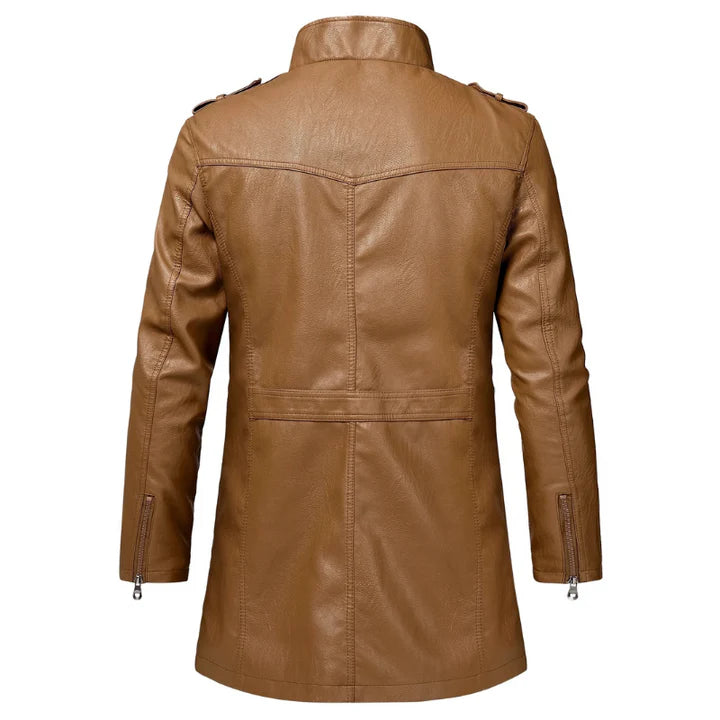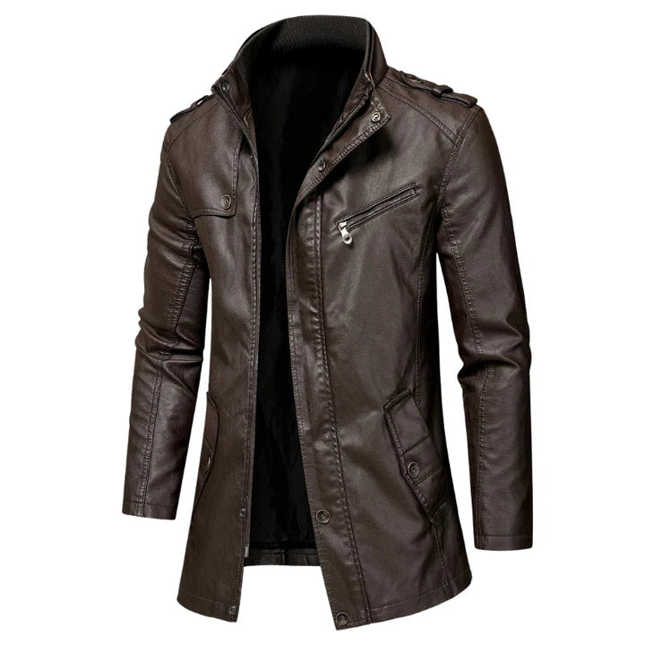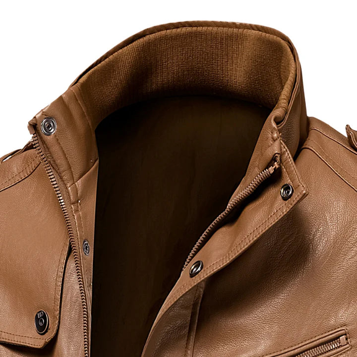 Crafted from premium leather, this jacket is built for durability and comfort. Featuring a zippered chest pocket, front snap closures, and a stand-up collar, it combines functionality with a modern edge.